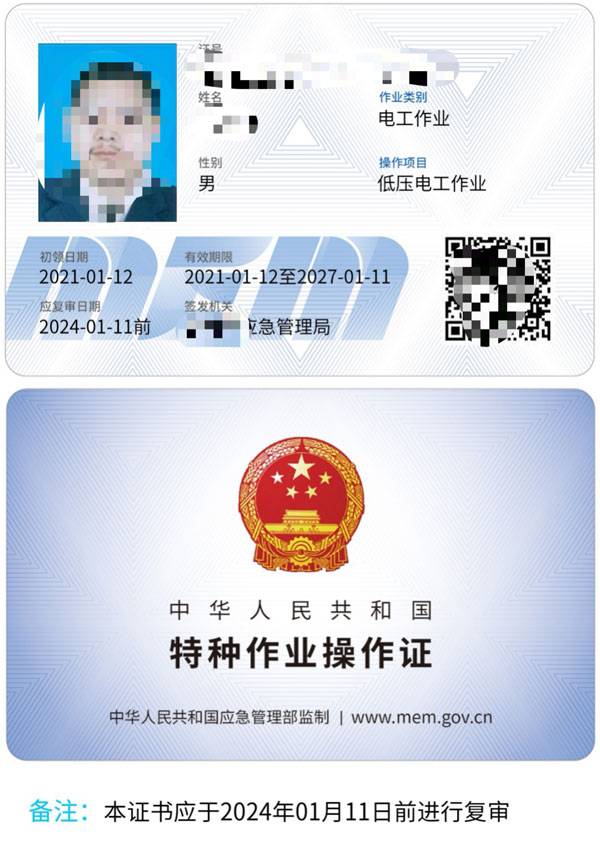 從2020年3月份起,高壓電工證書以新版的證書統一印制,分為電子證和實體證兩種類型,證書由相關部門頒發,有效期是6年,每3年復審一次。